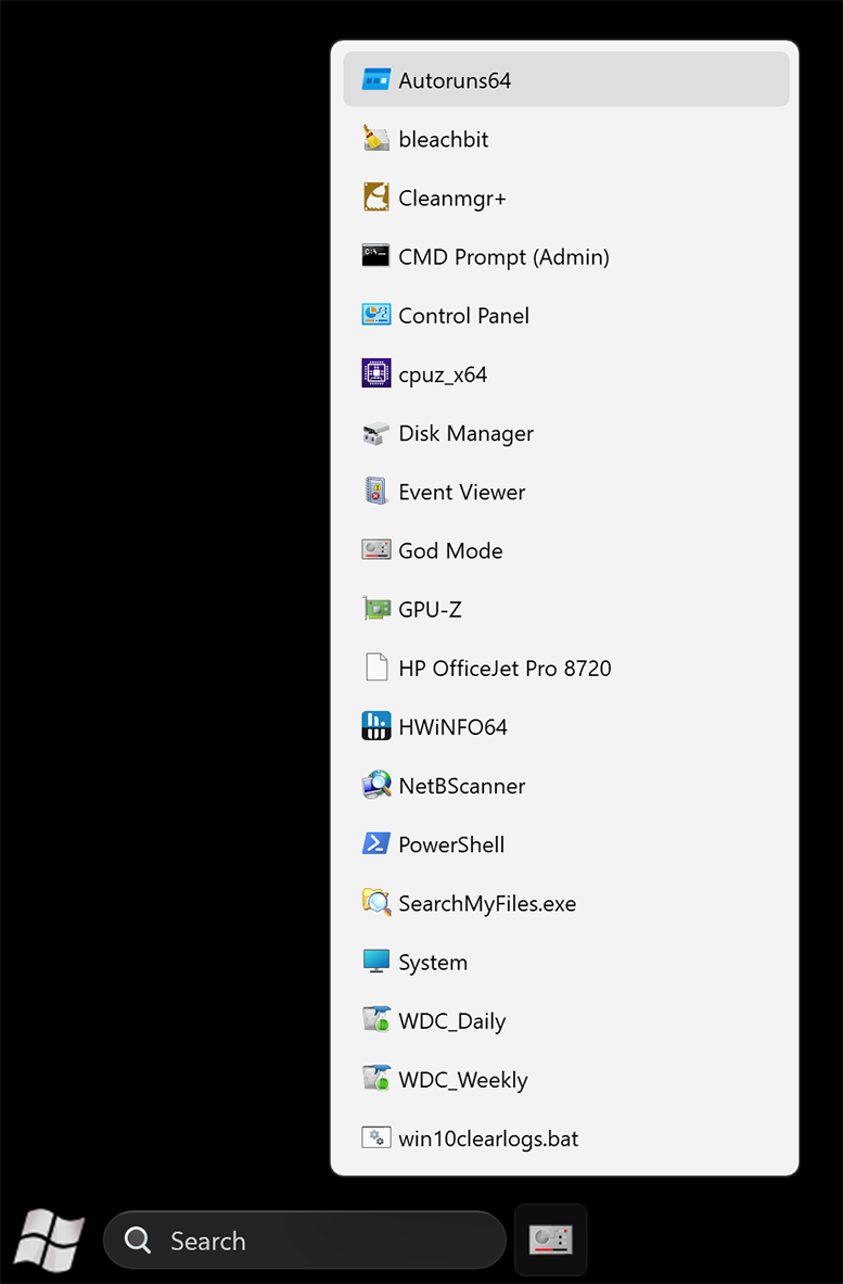 I keep a folder of portable tools that I use on every system. From there I create a menu I can access by either my start menu (via Start11) or the system tray.