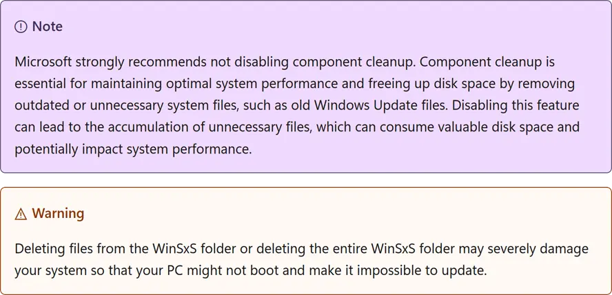 The operating system automatically reduces the size of the WinSxS folder by using methods similar to the ones described in this topic. Windows also uses internal processes to reduce the size of the WinSxS folder, such as uninstalling and deleting packages with components that have been replaced by other components with newer versions. Previous versions of some components are kept on the system for a period of time, allowing you to rollback if necessary. After a period of time, these older components are automatically removed from the installation.