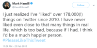 “I just realized I’ve “liked” over 178,000(!) things on Twitter since 2010. I have never liked even close to that many things in real life, which is too bad, because if I had, I think I’d be a much happier person.“