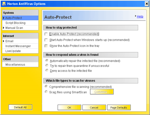 Click OK to go back to the main screen. Click on Options again and choose Norton AntiVirus. On the left of the screen click on Auto-Protect. Make your screen look like mine. (Under the "How to stay protected section", start at "Show the Auto-Protect icon in the tray" and uncheck each box, working your way UP.)