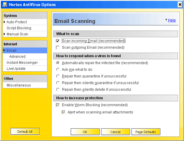Now click on Email in the left pane and uncheck "Scan outgoing Email".