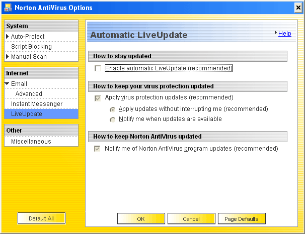 Now click on LiveUpdate in the left pane and uncheck "Enable automatic LiveUpdate". PLEASE remember to run LiveUpdate manually at least once a week! Click OK to go back to the main screen.