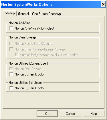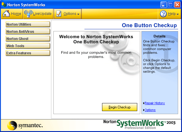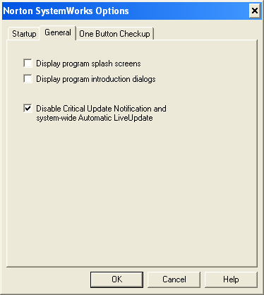After Installation After your first reboot the VERY FIRST thing you need to do is run Live Update. You should run it 3 times, rebooting after the first and second time. The third attempt should reveal "no new updates." Now lets configure this puppy! Double-click on the Norton SystemWorks icon on the desktop. On the screen that pops up (we'll call this the "main screen" from now on), click on the Options button and choose Norton SystemWorks.