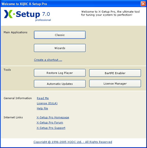 What is X-Setup? X-Setup is a tweaking program. That is, it allows you to make changes to your computer's settings. X-Setup can modify both the OS interface for both appearance and usability as well as change various performance and security settings. It can also make changes to a whole variety of 3rd party programs. Some of these changes are usually only available by direct editing of the registry. X-Setup supports Windows 95 all the way up to Windows Server 2003. You can choose the Classic mode or Wizard mode to use the program although the Classic mode offers access to more tweaks.