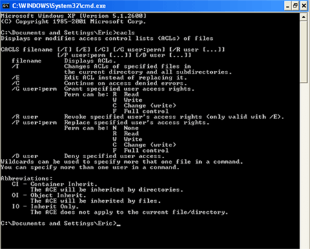 To go to a different directory type CACLS X (where X is the directory name). You can add switches to change/edit permissions. If you don't understand the switches you shouldn't mess with this method people! I hope this article helps you. Questions? Comments? contact me. * Heed my warnings. I am not responsible if you mess things up. |